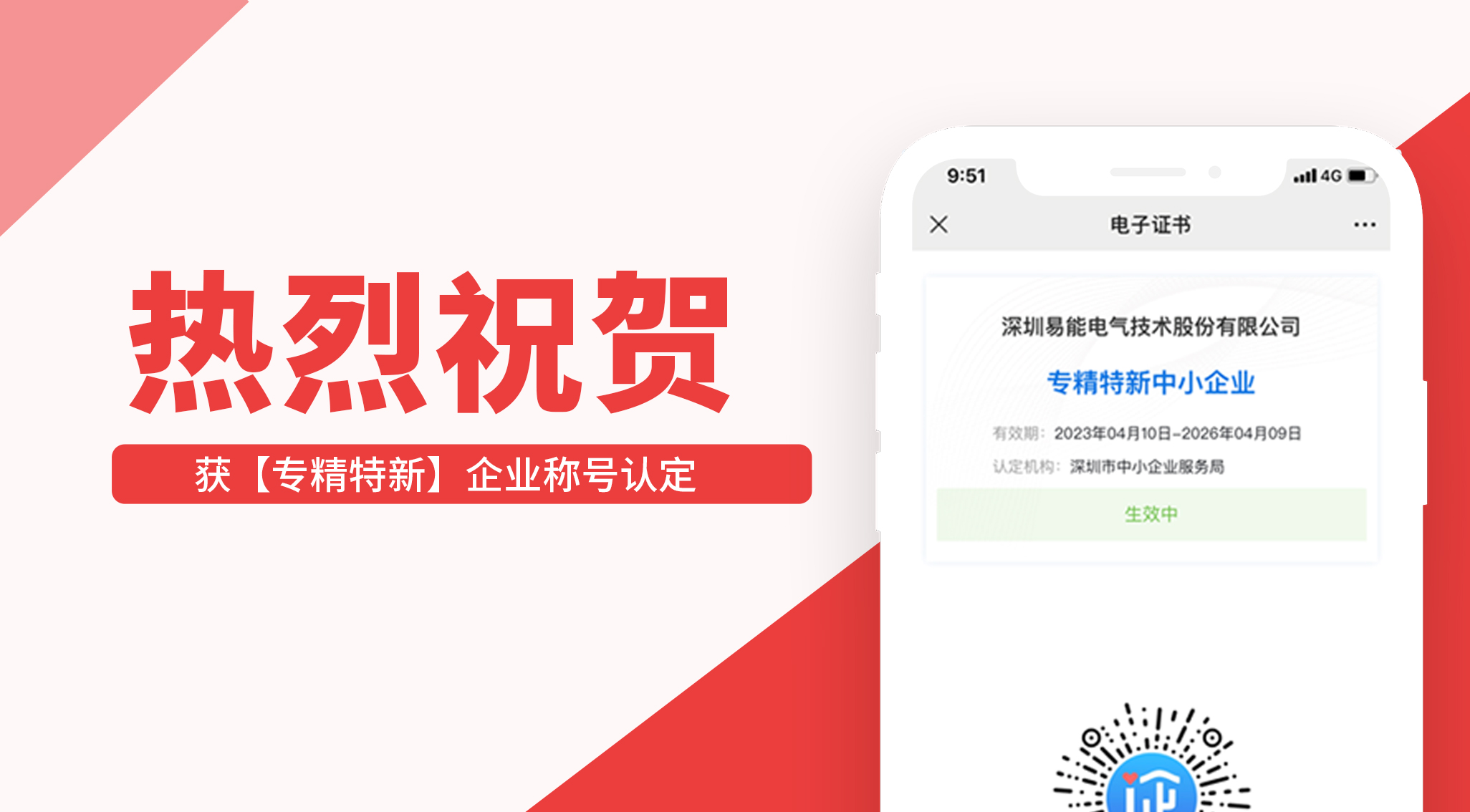 據(jù)深圳市“專精特新”中小企業(yè)名單公示,易能電氣憑借專業(yè)技術(shù)水平,創(chuàng)新能力等綜合實(shí)力成功獲評深圳市“專精特新”中小企業(yè)稱號。